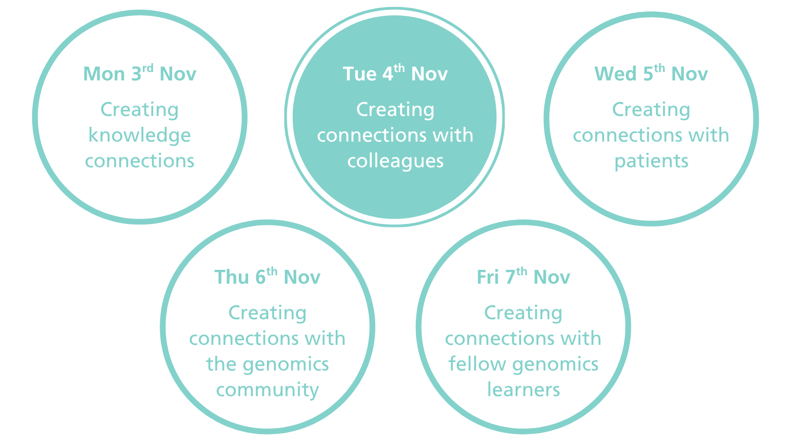 Today’s focus is on creating connections with colleagues and building the confidence to be able to talk about genomics and seek support when needed.