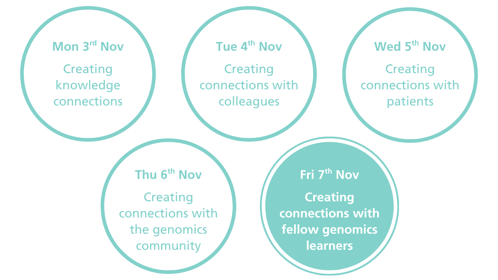 Today’s focus is on creating connections with fellow genomics learners. Genomics isn’t a one-time course – it’s a growing community.