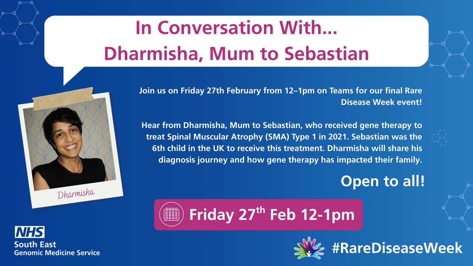 Join us for a our final event of Rare Disease Week to hear from Dharmisha, Mum to Sebastian, who was the 6th child in the UK to receive treatment for Spinal Muscular Atrophy (SMA) Type 1 in 2021.