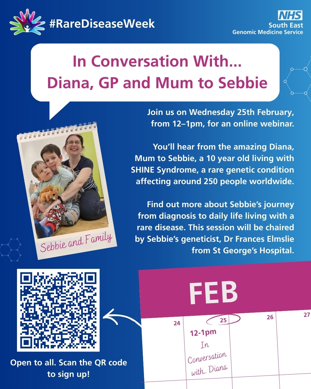 Join us on Teams on Wednesday 25th Feb from 12-1pm to hear from the amazing Diana, GP and Mum to Sebbie.