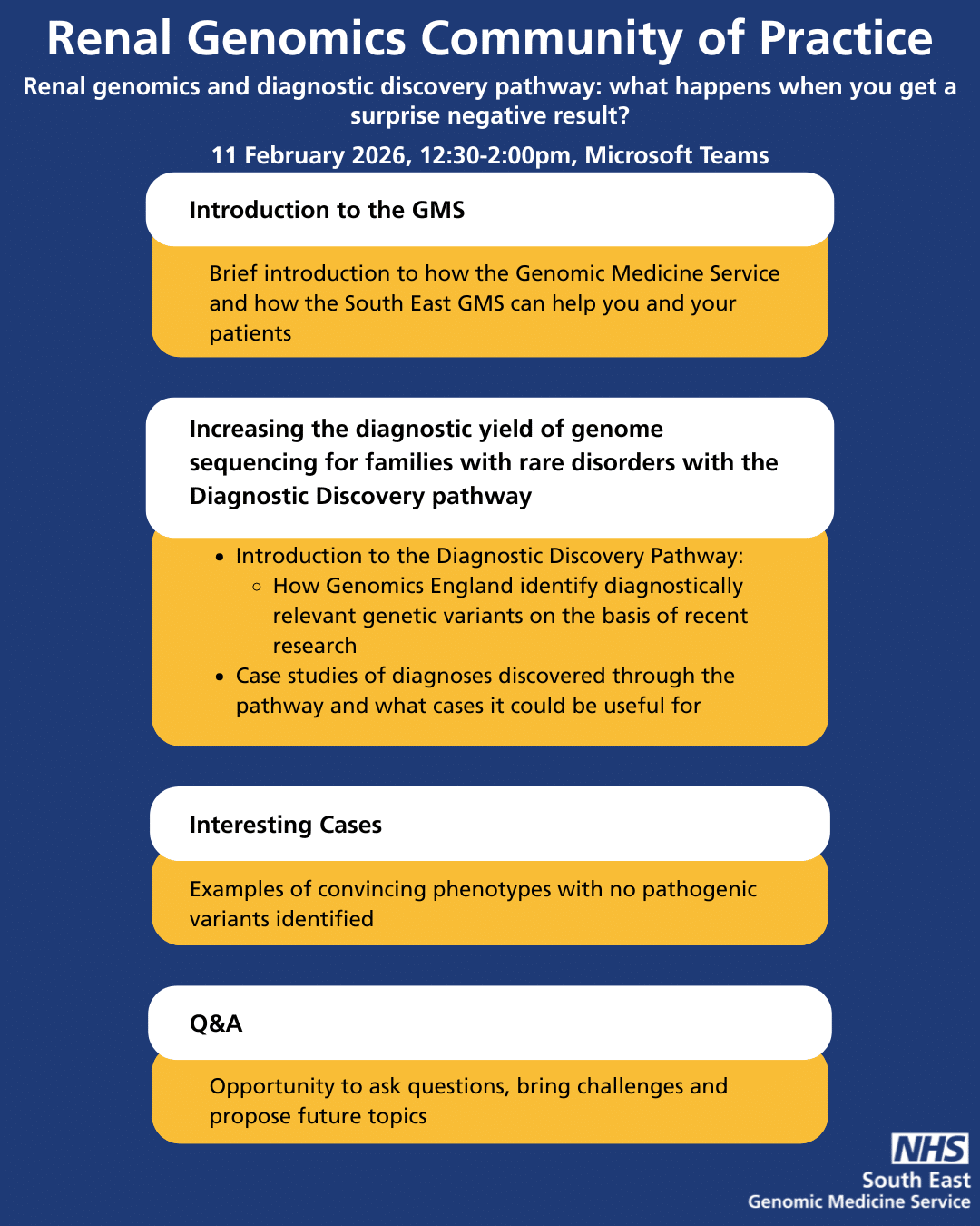 We presented our vision for the South East Genomic Medicine Service Renal Community of Practice at the South West & East Kidney Society Meeting. Check out our poster to find out more!